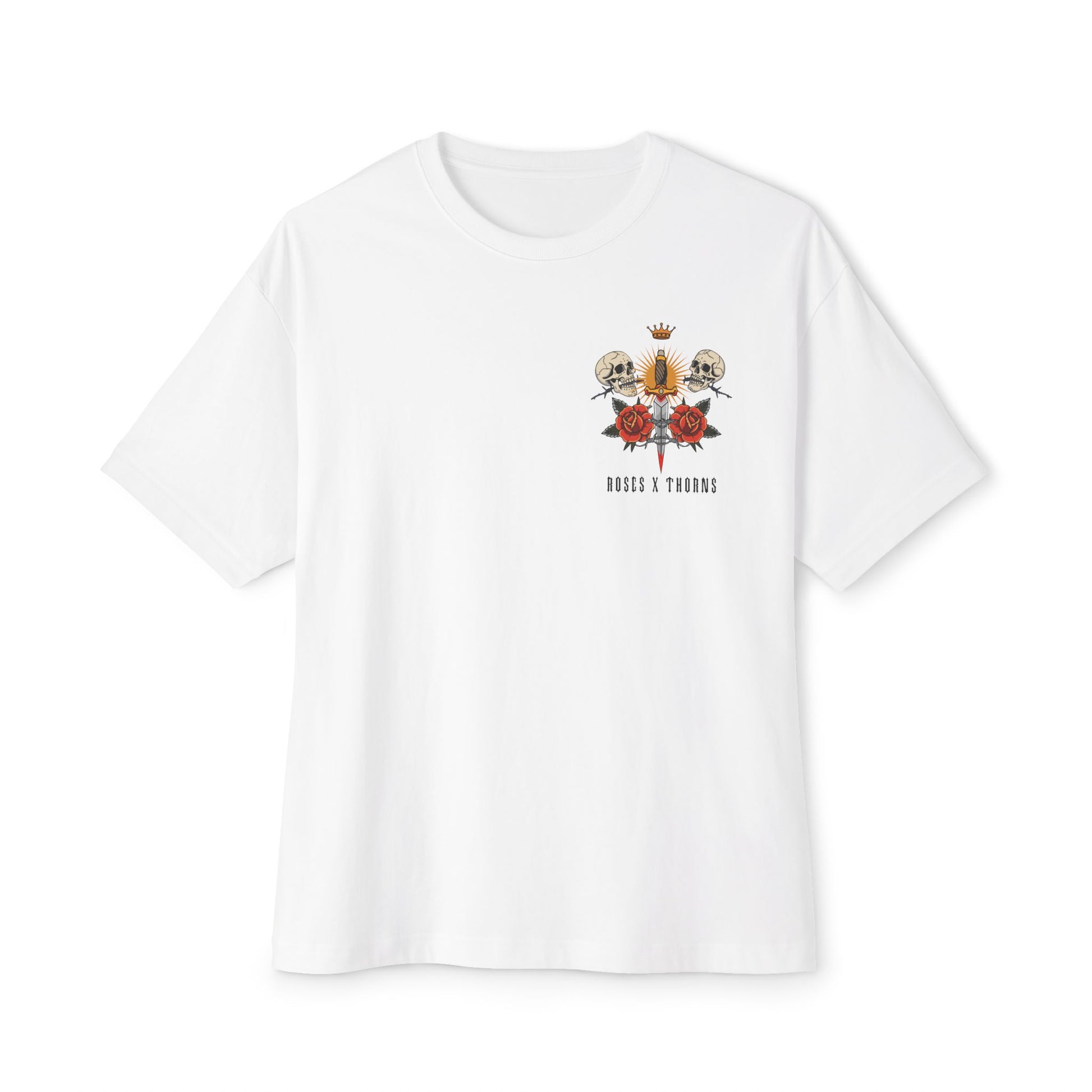 A relaxed, art-forward tee that wears like a lived-in favorite. The oversized boxy silhouette drapes softly from dropped shoulders, giving room to move and layer without feeling bulky. Front and back artwork blends vintage tattoo iconography — skulls, roses, a crowned dagger and radiant candle — into a bold story: beauty and grit intertwined. Wear it to shows, late-night drives, or when you want an effortless statement that reads lived-in and personal. The medium-weight cotton feels breathable yet substantial, and the tear-away label keeps the neck comfortable. Break it in, roll the sleeves, and let the graphic age with you.
